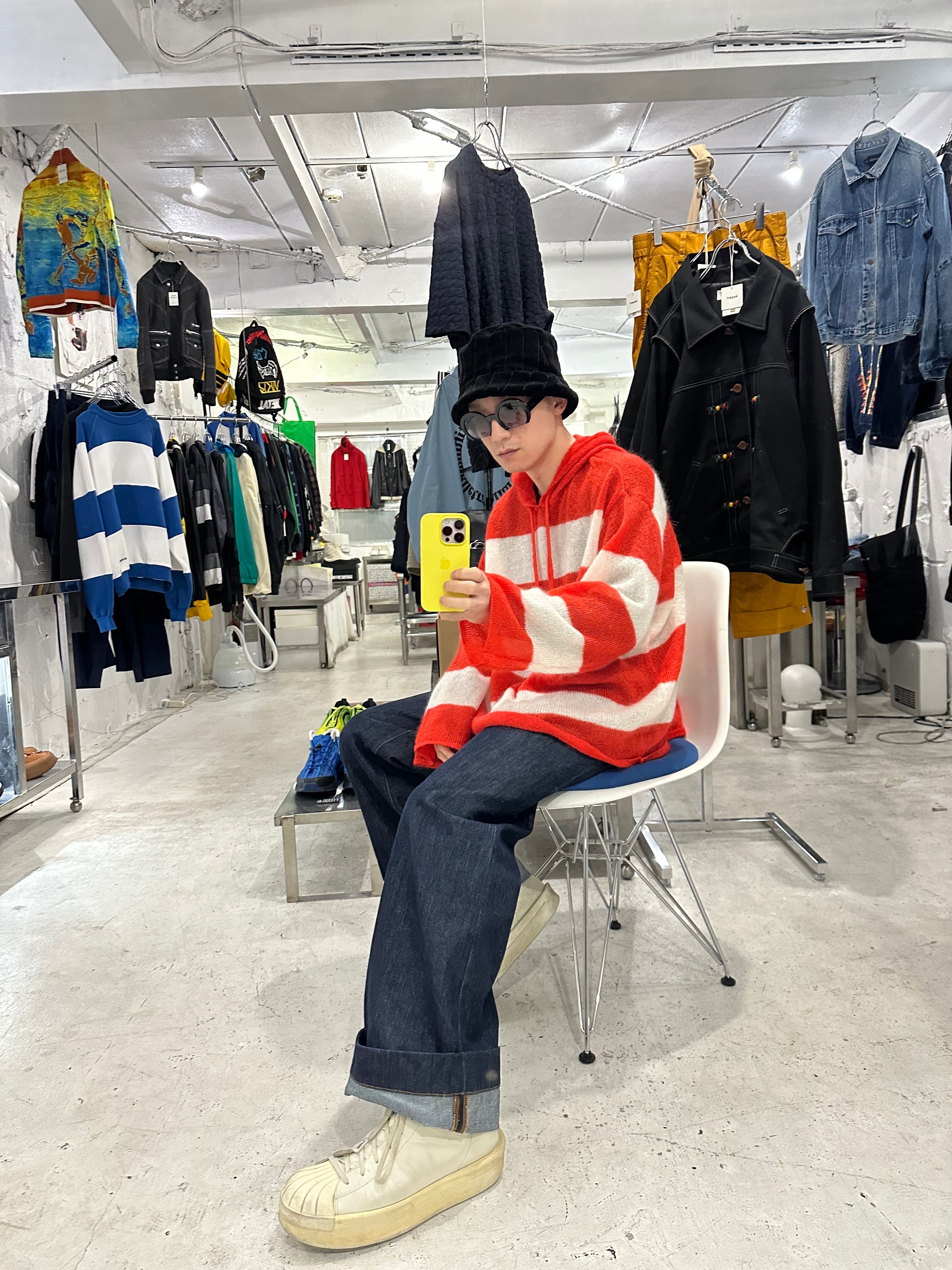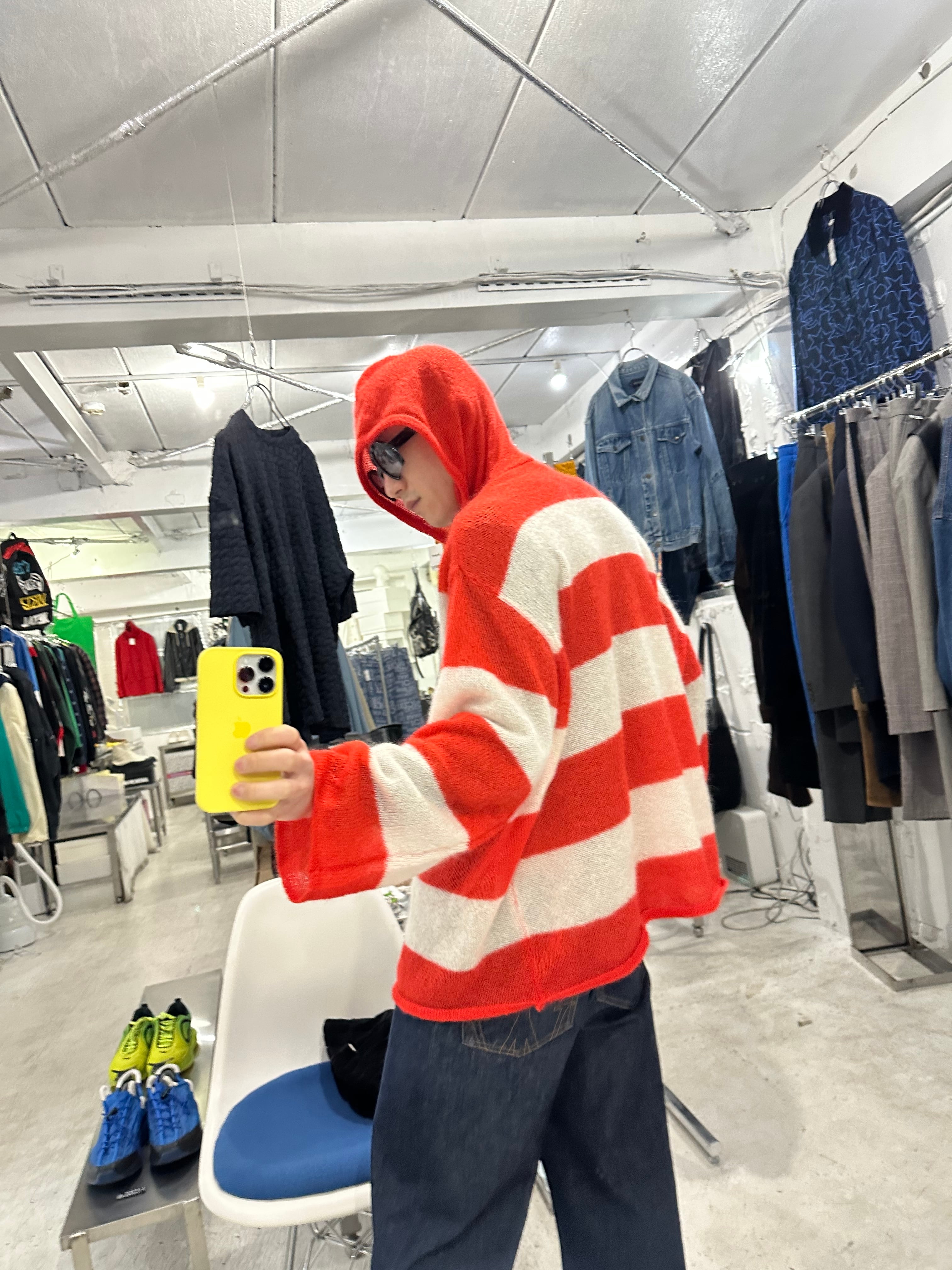 『SUNNEI』KNIT HOODIE / cream & bright red stripes